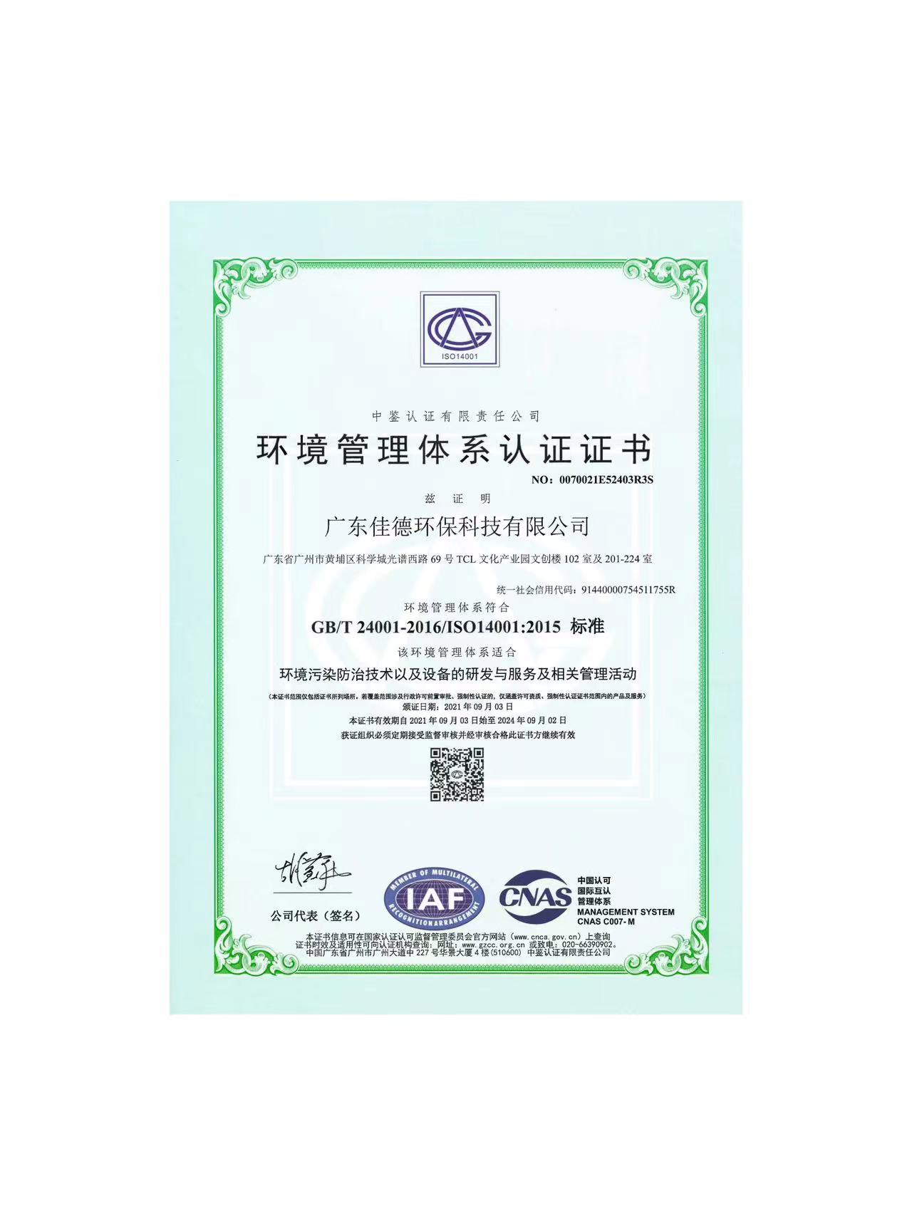 環(huán)境管理體系認(rèn)證證書