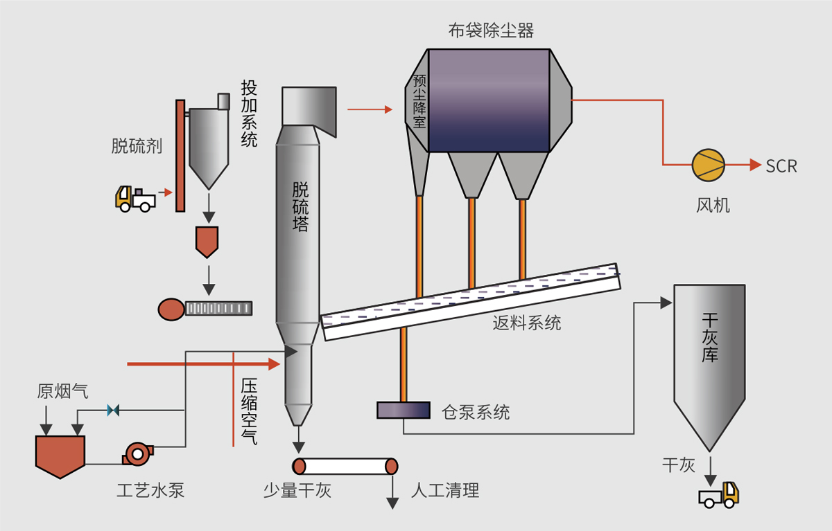 煙氣從底部進(jìn)入脫硫塔,在脫硫塔的進(jìn)口段,高溫?zé)煔馀c加入的脫硫劑、循環(huán)脫硫灰充分預(yù)混合,進(jìn)行初步的脫硫反應(yīng),在這一區(qū)域主要完成脫硫劑與SO?、SO?的反應(yīng)。